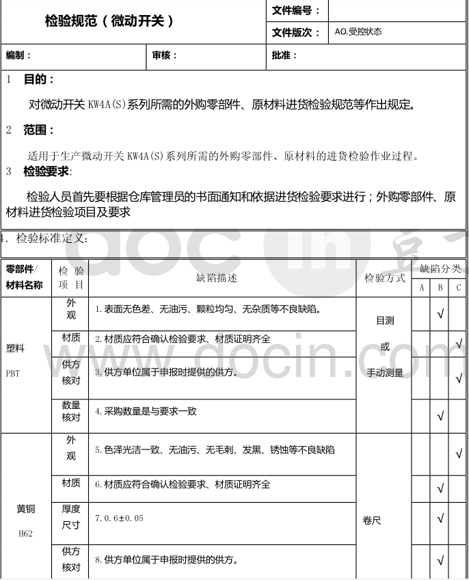 為什么要 有微動開關檢驗書呢?因為里面清晰的寫明微動開關的外觀、材質、厚度材質還有數量等。下面給大家分享一下微動開關進貨檢驗書: