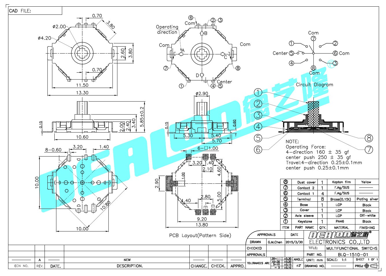 多功能開關(guān),型號:BLQ-1510-01,尺寸:11.5mm*10mm,由德藝隆精密工業(yè)股份有限公司研發(fā)生產(chǎn)。自主開發(fā)產(chǎn)品包括多功能開關(guān)、輕觸開關(guān)、檢測開關(guān)、滑動開關(guān)、帶燈輕觸開關(guān)、按鍵開關(guān)、微動開關(guān)、耳機(jī)插座、DC插座等。